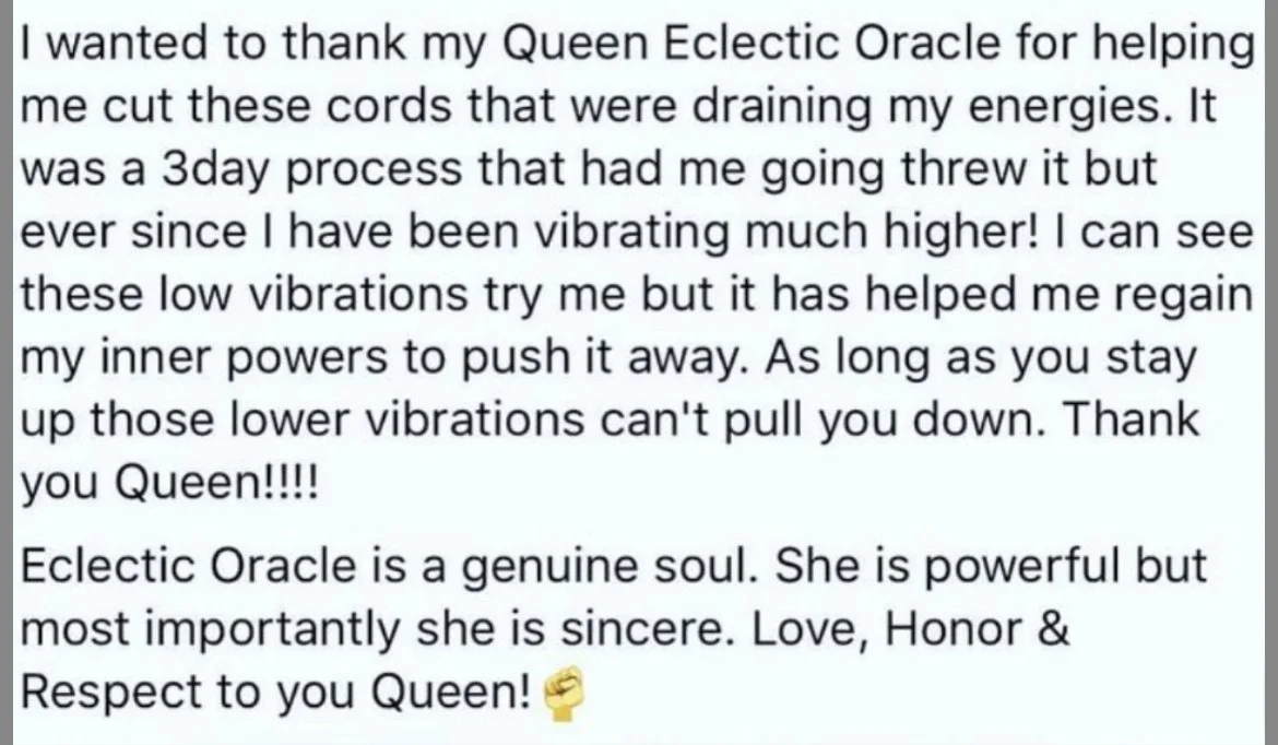 A Etheric Cord Cutting is a spiritual surgery of sorts. Throughout the journey of life we pick up a lot of energies, soul ties, sexual demons & etc.. Having these energies & entities attached can drain you and block your abundance. During the procedure I use my spiritual tools to talk you into your minds eye where we confront the attachments and I cut them from you. This service is extremely popular & pairs well with Therapy.